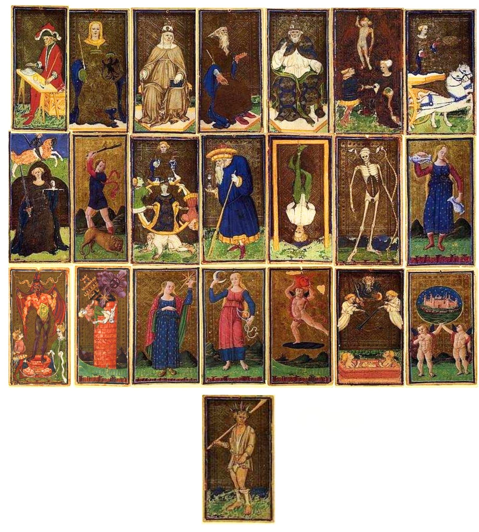 Esse objeto artístico que se têm notícia era conhecido como o Tarot de Visconti-Sforza (imagem desse post), confeccionado por Bonifácio Bembo, por volta do século XV. Esse Tarot foi assim encomendado para as bodas da filha do duque de Milão, Bianca Maria Visconti, que no ano de 1441 casou-se com Francesco Sforza. Eis o porquê do nome. Mas há quem encontrou referências ainda mais antigas como Oswald Wirth (ocultista francês de 1888 e pesquisador, autor do Tarot com o mesmo nome) nos registros do sínodo de Worcester (esses registros se encontram na Catedral de Worcester, Inglaterra) que havia proibido os clérigos de terem acesso a um jogo conhecido como o “jogo do Rei e da Rainha”, em meados de 1200.