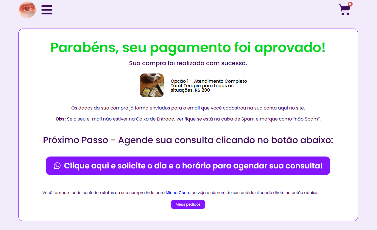 Os atendimentos são feitos por vídeo chamada, via Whatsapp, são 100% on-lines e sigilosos. Ao realizar sua compra 100% segura (Mercado Pago) através de Pix, Cartão de Crédito ou Boleto, aguarde a atualização da tela de pagamento e siga as instruções para solicitar o dia e horário para agendar sua consulta, clicando no botão do final da página, veja o exemplo abaixo: “Clique aqui e solicite o dia e o horário para agendar sua consulta”.