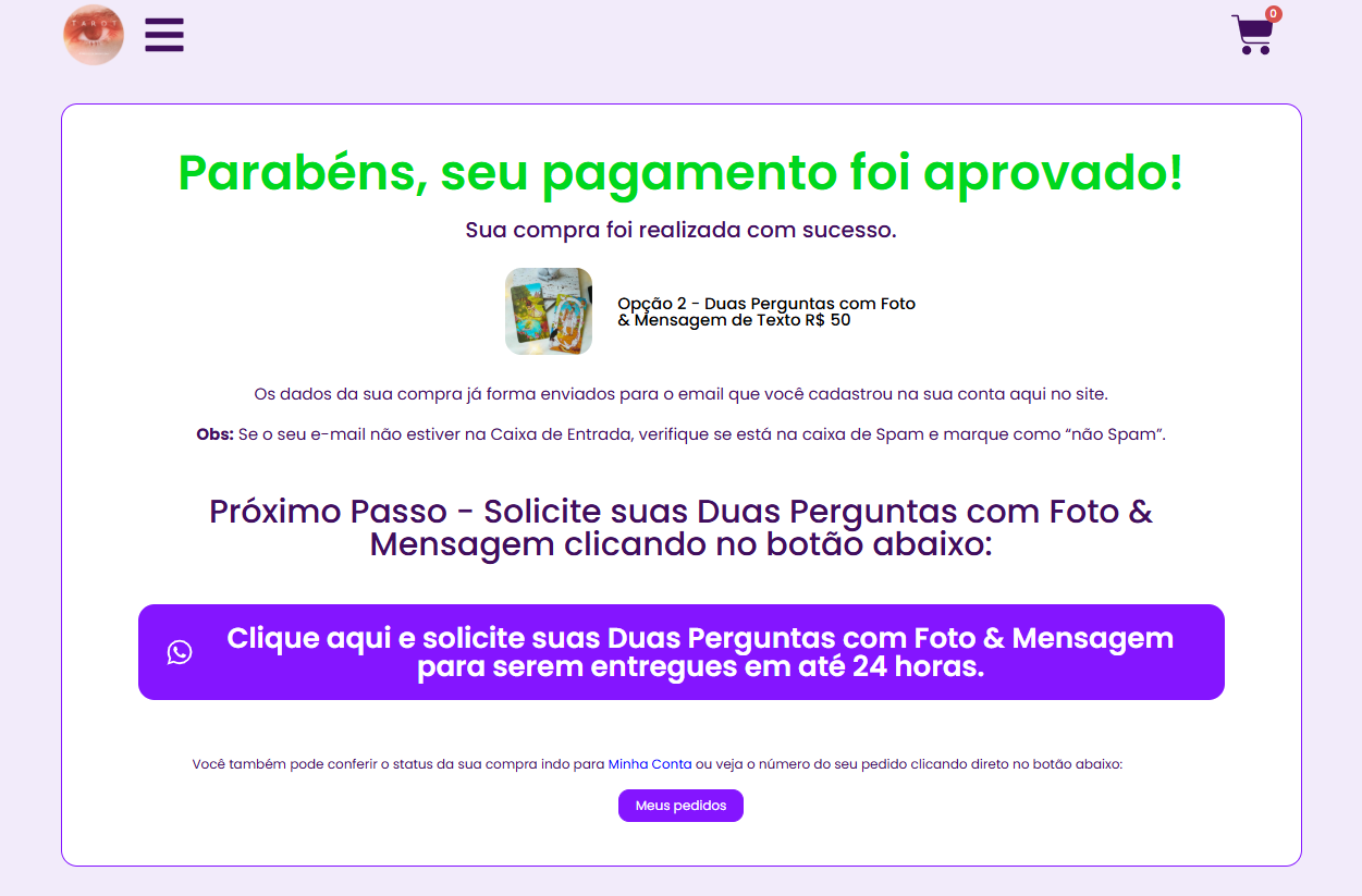 As perguntas de Foto & Mensagem são enviadas diretamente no Whatsapp do(a) consulente no prazo máximo de 24h. Da mesma forma dos atendimentos acima, ao realizar sua compra 100% segura (Mercado Pago) através de Pix, Cartão de Crédito ou Boleto, aguarde a atualização da tela de pagamento e siga as instruções para enviar sua(s) pergunta(s), clicando no botão do final da página, veja o exemplo abaixo: “Clique aqui e solicite suas Duas Perguntas com Foto& Mensagem para serem entregues em até 24 horas”.